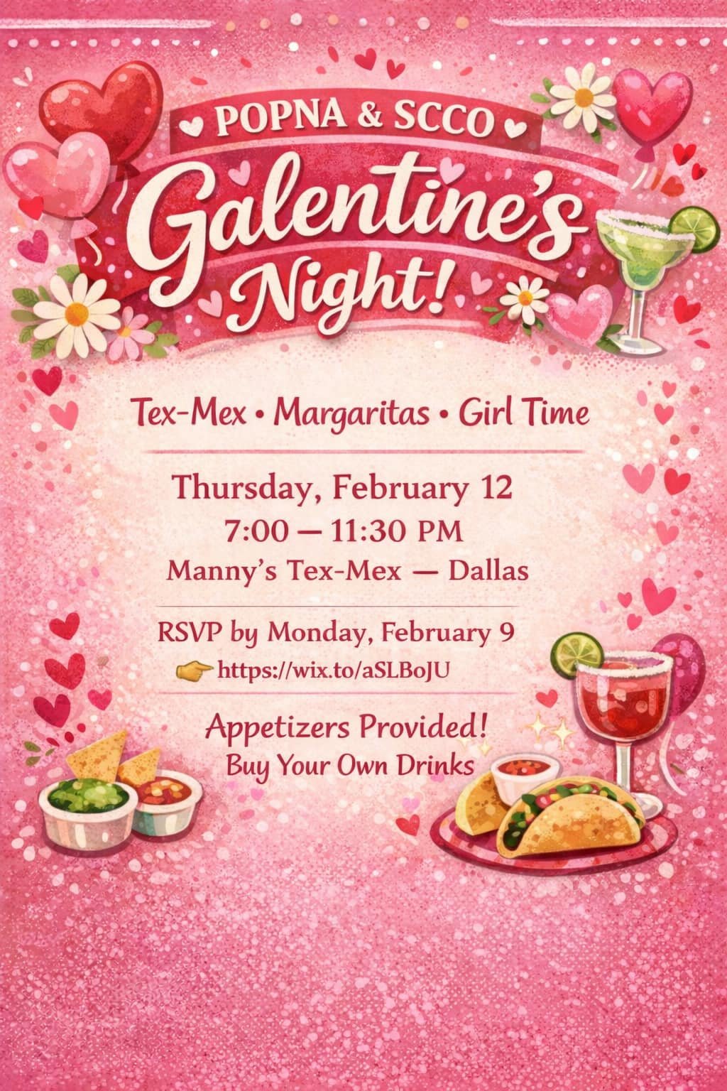 Join us for a ladies Galentines event on February 12th at 7pm. Meet at Manny’s Tex- Mex. All ladies are welcome for a fun night with neighbors! Light appetizers will be provided. Click below to RSVP.